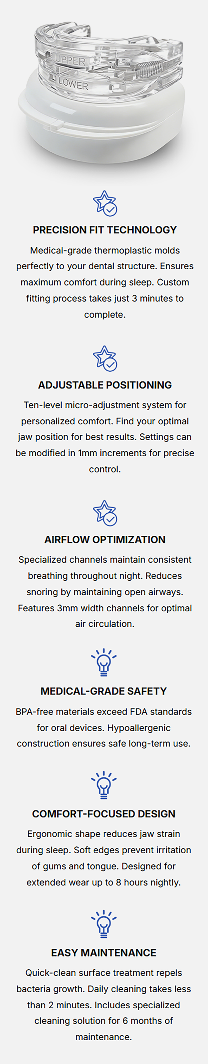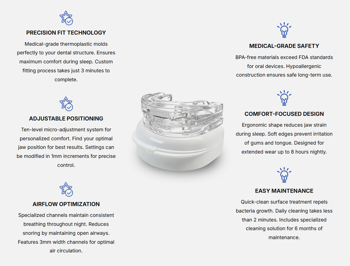 - Dual-Tray Jaw Advancement – Gently moves the jaw forward to open the airway and reduce snoring.