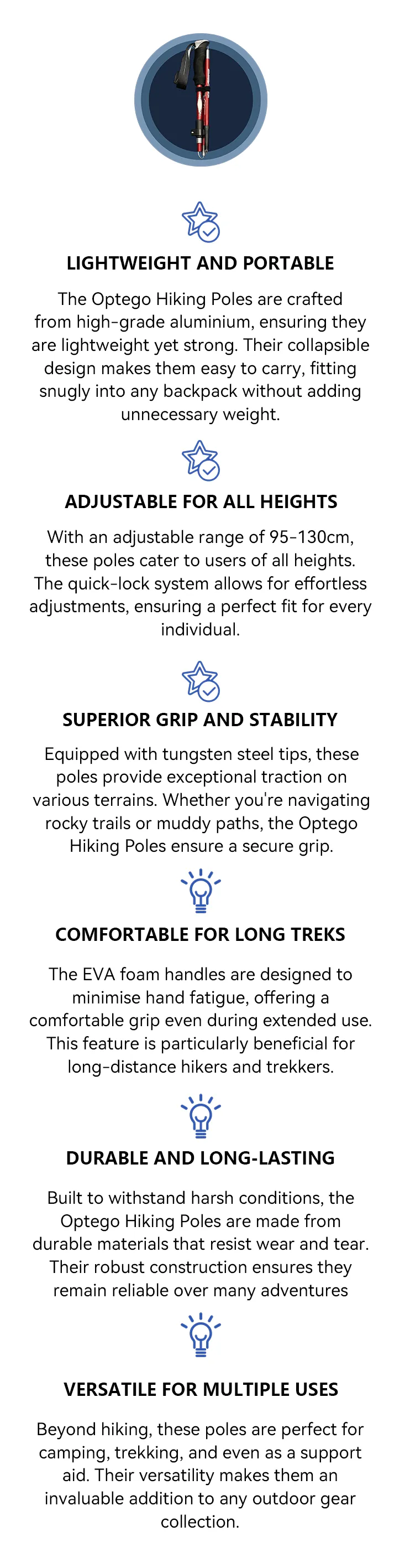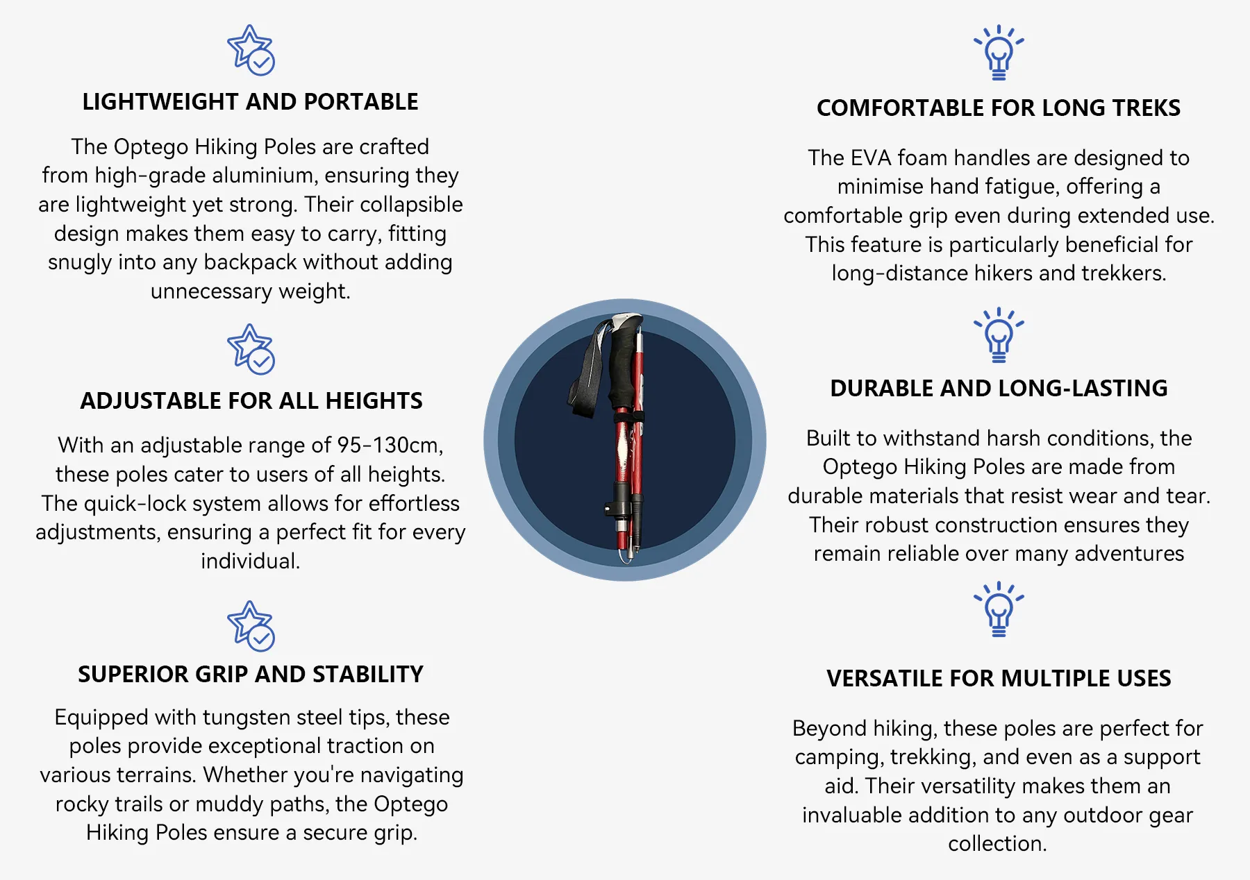 The Optego Hiking Poles feature tungsten steel tips that provide exceptional grip on all types of terrain, from rocky paths to slippery slopes. Their robust construction ensures stability, reducing the risk of slips and falls, making them ideal for both beginners and seasoned hikers.