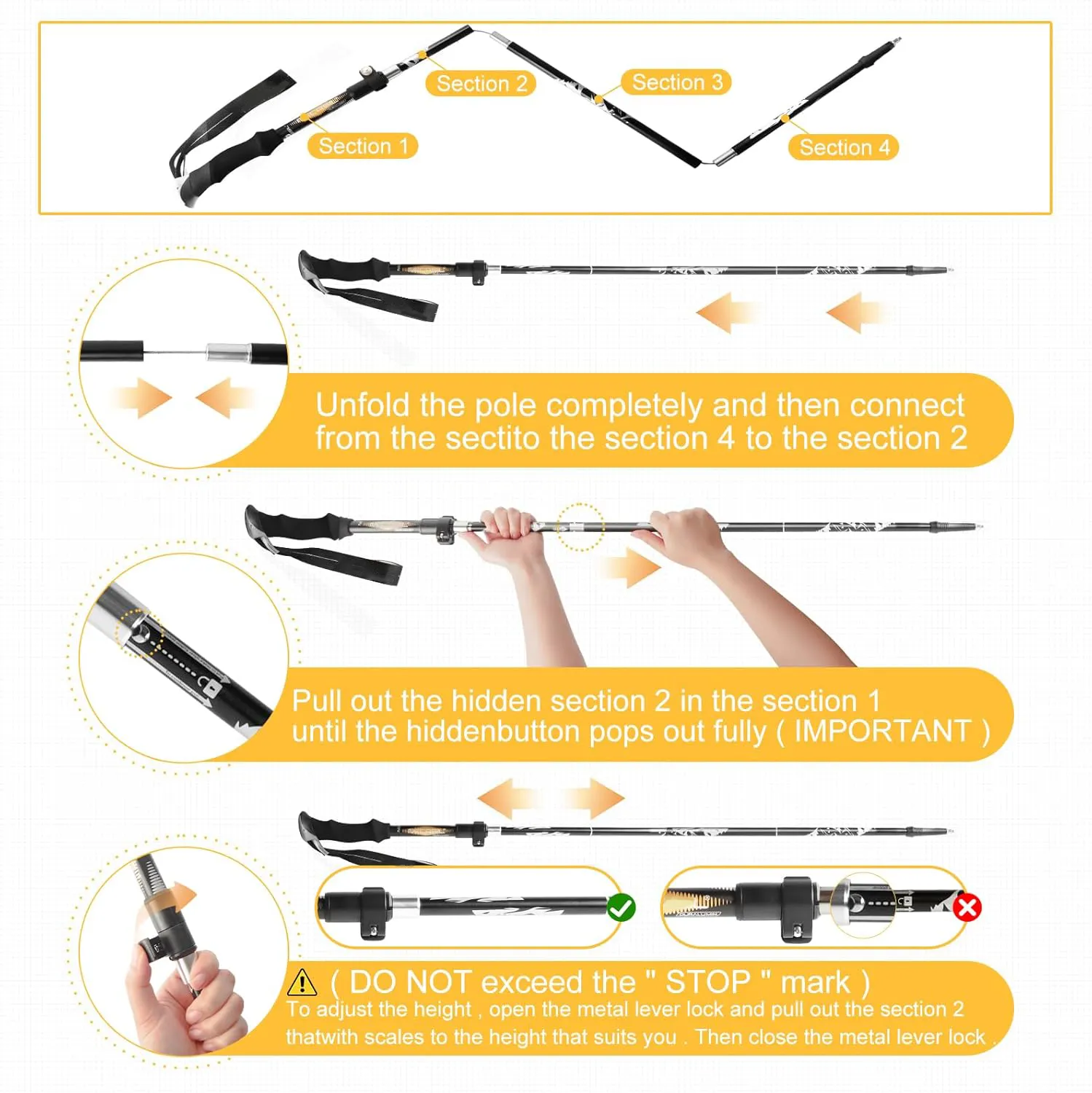 Adjusting the height of your Optego Hiking Poles is simple. Just loosen the quick-lock mechanism, extend or retract the pole to your desired height, and securely tighten the lock.